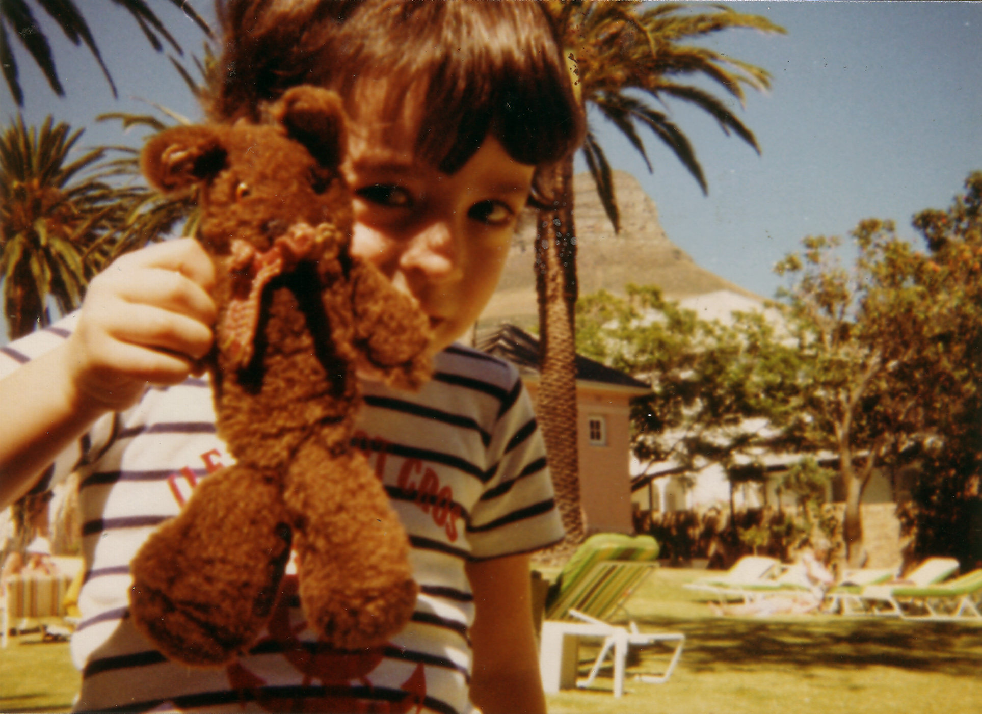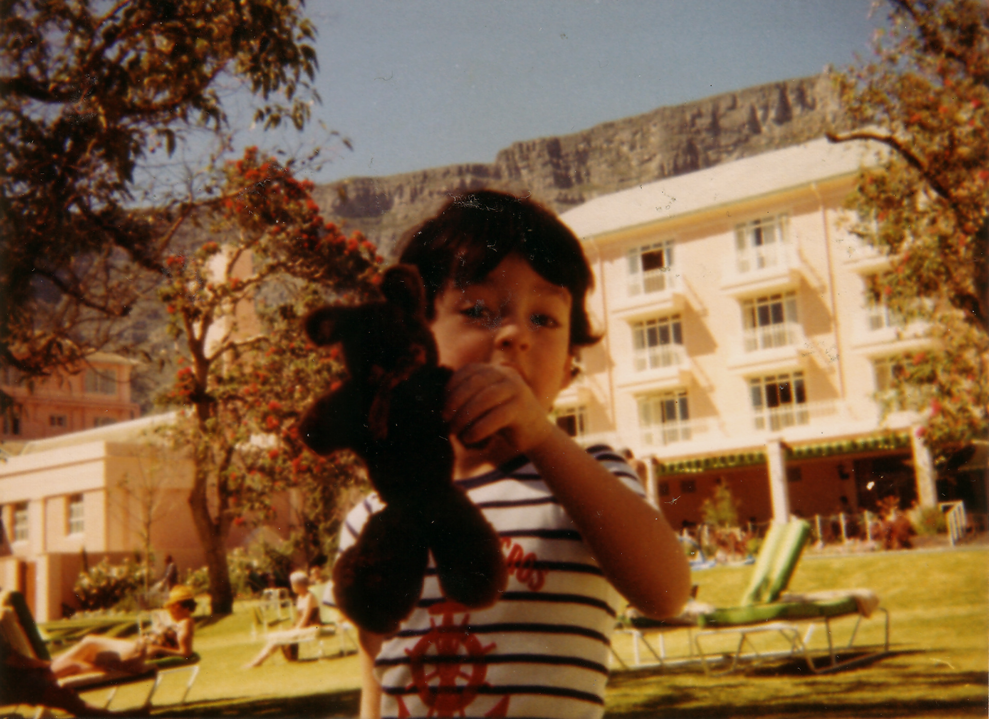 About the same time, (possibly even before), my pal Lin took me to Cape Town, South Africa- this time no question of where this was taken, for these two pictures (taken with her charge, she was a nanny at the time), clearly show Table Mountain behind us.