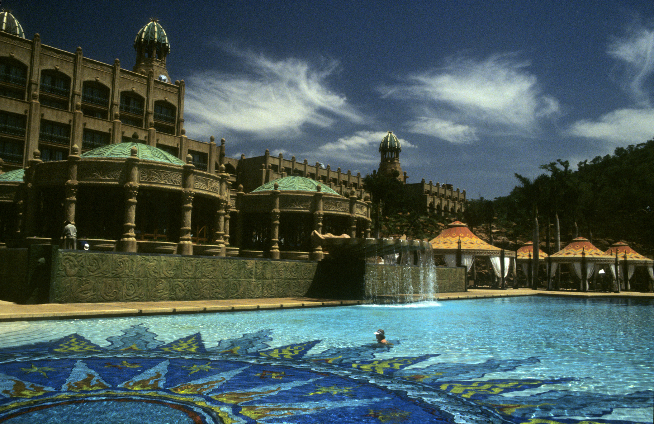 Dame Joan Collins DBE. Hard to tell, but we’re in Sun City, South Africa, attending the grand opening of the ‘Lost City at Sun City’ resort. Here’s a view from one of the pools…